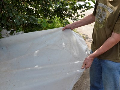 Om de folie, die onder het schaduwdoek bevestigd lag, hoefde vervanging nog niet. ‘Voel maar eens hoe taai dit nog is’, zegt Jan de Wagt die het oude folie vastpakt er aan trekt.
