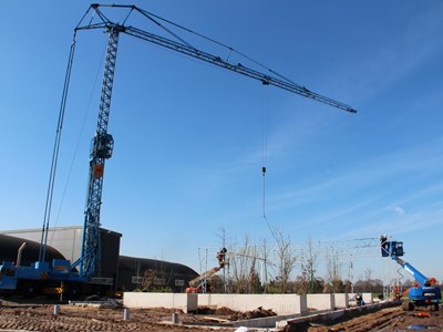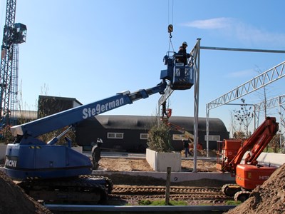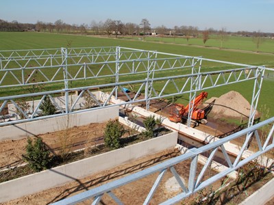 De staalconstructie van Het Varkenshoff is met groot materieel opgezet waarmee de bijzondere varkensstal vorm begint te krijgen. Het Varkenshoff is een innovatief huisvestingsconcept dat uitgaat van de oorspronkelijke leefomgeving en het natuurlijke gedrag van de varkens.