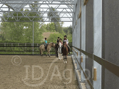 Vermeldingswaardig is dat aan 1 zijde van de rijbaan van 20 meter breed, het dak van de Horse Lounge 3 meter "zwevend" doorsteekt, waardoor er een riante luifel is gesitueerd waar toeschouwers droog kunnen staan en waar divers materieel droog gestald kan worden.