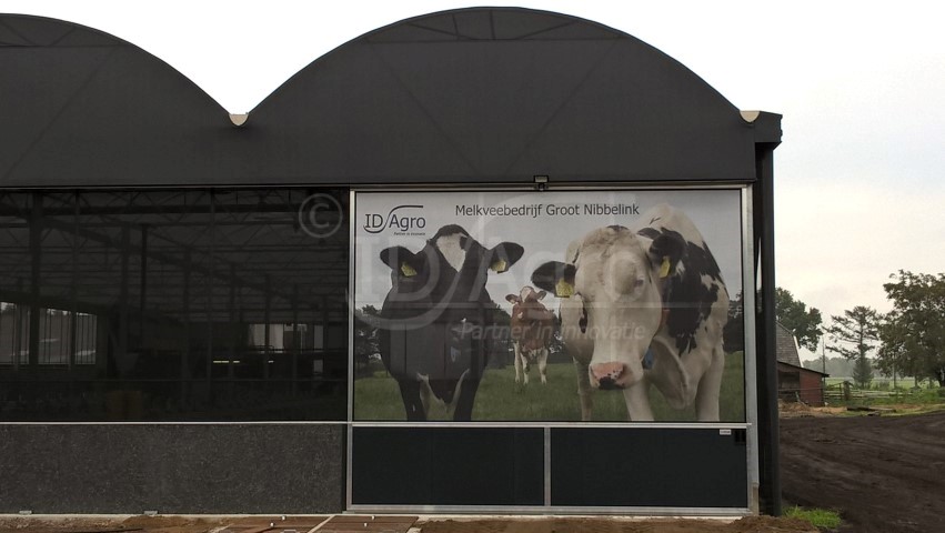 Volop daglicht bij de koeien maakt het een plezier om in deze stal te zijn! De Serrestal neemt zich daar mooi op in het prachtige landschap en is goed herkenbaar aan de unieke foto print op de schuifdeur van de Serrestal.