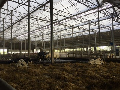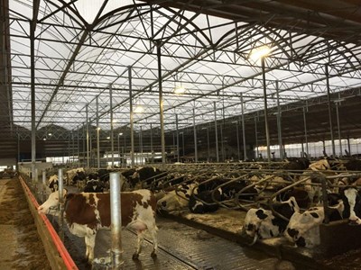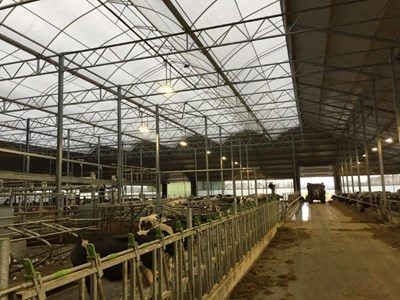 Deze bijzondere lichte stal bied plaats aan 500 melkkoeien. Door de toepassing van bedienbare ventilatiegordijnen kunnen alle gevels geopend worden waarmee het transparante karakter van het gebouw extra word benadrukt