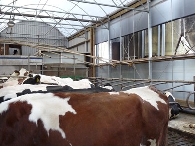 Het betreft hier het vervangen van de bovenbouw van een gedateerde ligboxenstal. De gehele bovenbouw, die voorzien was van asbest dakbedekking,is vervangen door een Serrestal bovenbouw. Langs de zijgevel is een nieuwe fundering voorzien waardoor er meer kopruimte voor de dieren is ontstaan. Door het plaatsen van de Serrestal bovenbouw is er meer natuurlijk daglicht en beter ventilatie ontstaan.