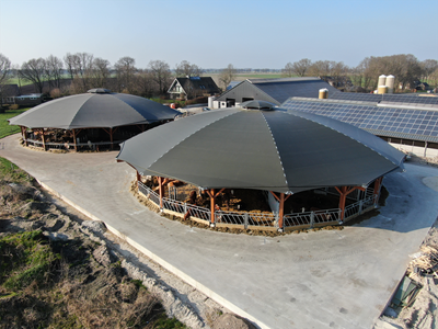Vorig jaar mochten we bij Boer Back al een houten Roundhouse 30 realiseren en onlangs hebben we een tweede houten Roundhouse gebouwd. Samen vormen ze een Twin-opstelling.