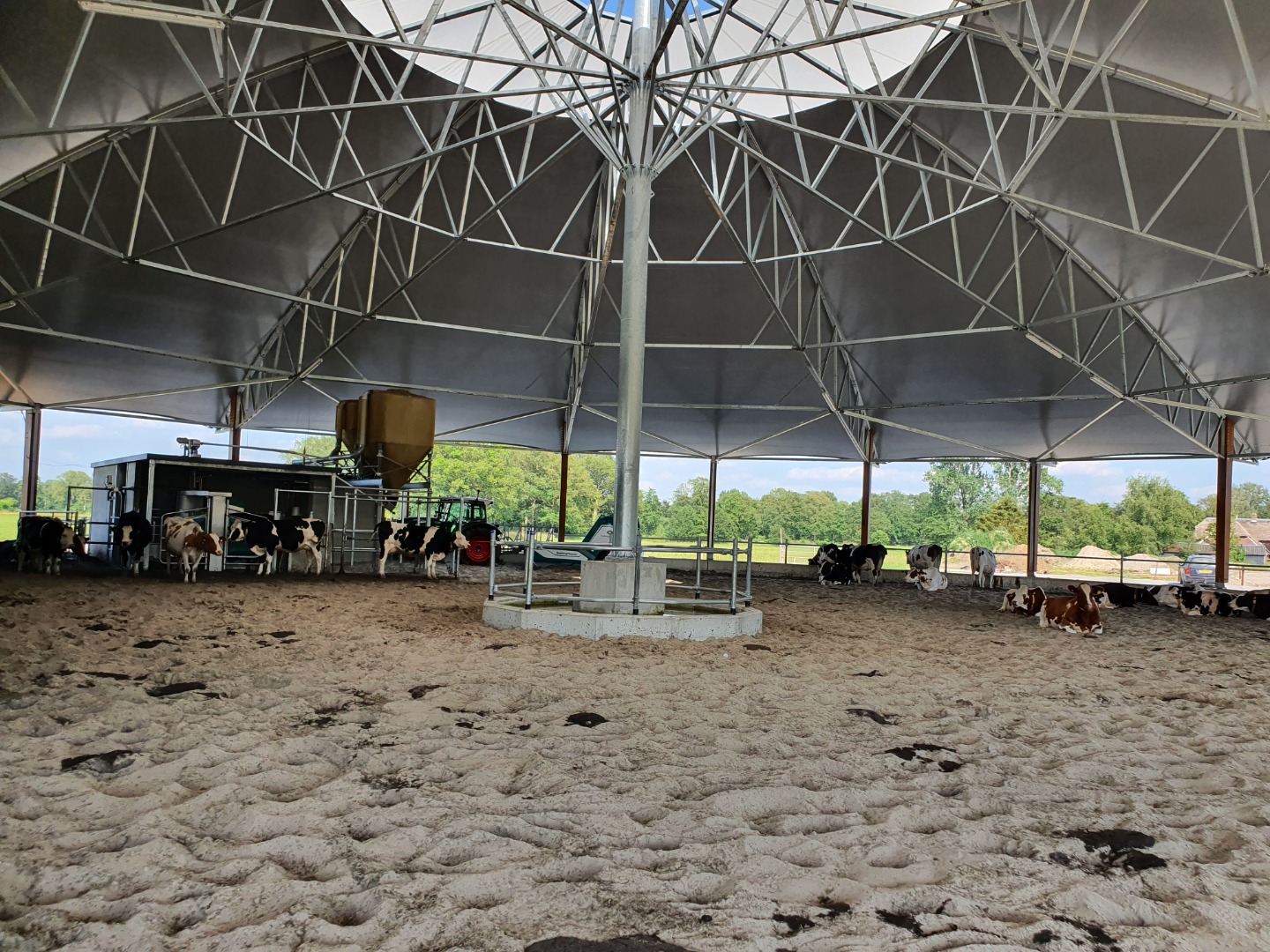 * Bij dit stal principe hebben de koeien erg veel ruimte, een Roundhouse 45 op zichzelf zou namelijk ook ruimte kunnen bieden voor 120 melkkoeien op stro.