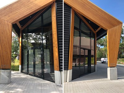Afgezien van de glaspui in de voorgevel komt al het licht door het dak binnen - een ongekende ervaring voor een dergelijk constructie. Een mooi detail is dat de spanten zowel aan de buiten als ook aan de binnenzijde zichtbaar zijn en de verschillende luchtkussen opdelen. De industriële en donkere look van de geïsoleerde wandpanelen laat de houtenconstructie nog mooier naar voren komen.